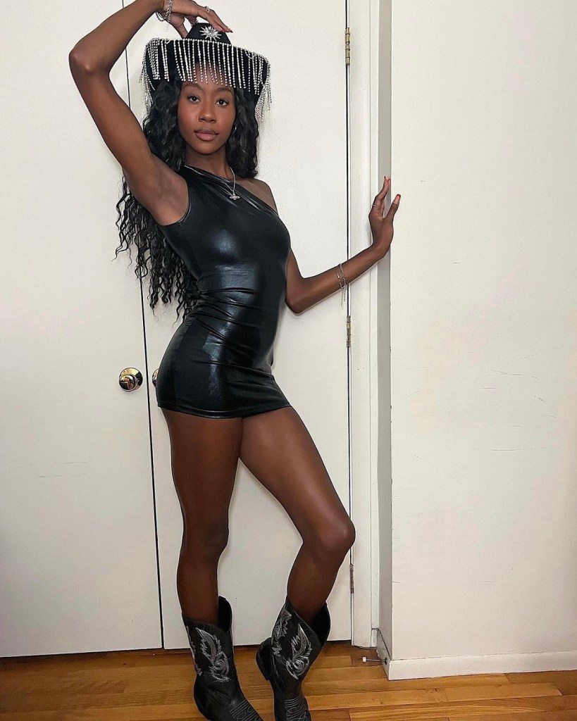 The outfit I wore for the actual concert was a shiny black mini dress (CouCoo dupe from Shein), my black cowboy boots, the same cowboy hat, and my beloved Vivienne Westwood Saturn pendant necklace.